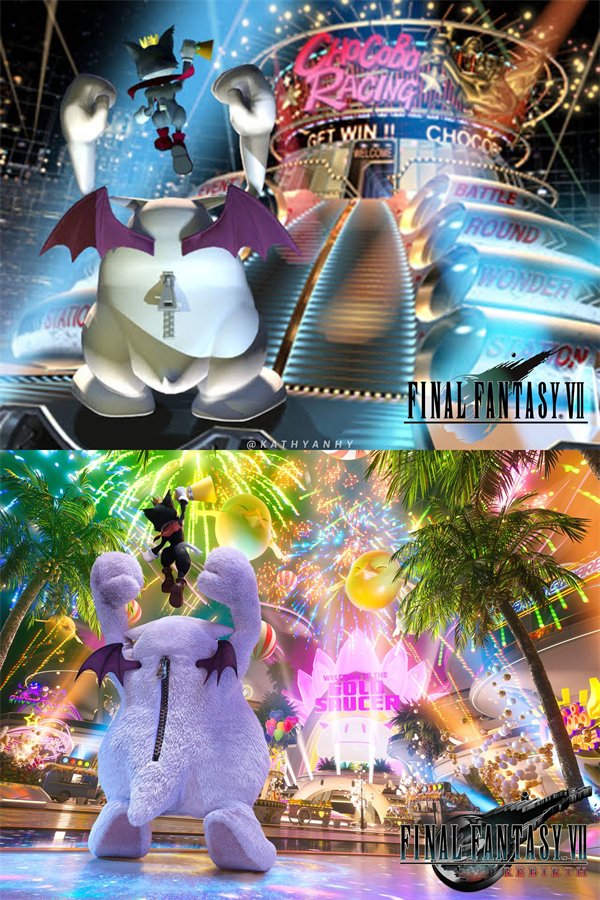 The two images feature Yuffie and Cait Sith & Mog, and they actually adopt the same composition and elements as the two promotional images from the original 1997 version of Final Fantasy VII. Blogger @kathyanhy has shared a comparison image of these two sets of promotional images.