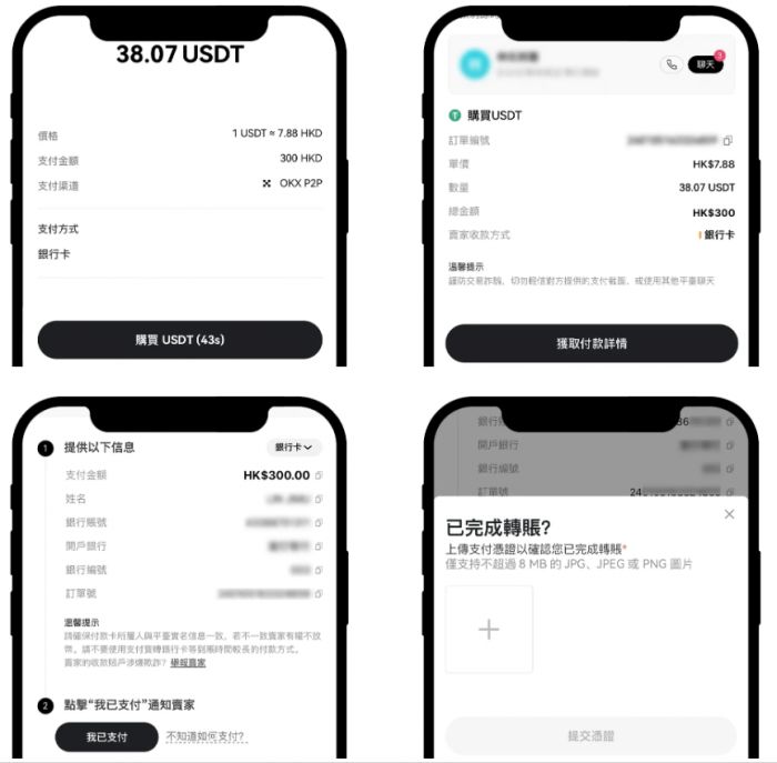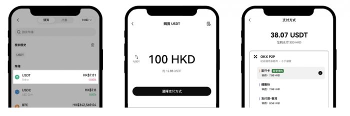 2. Choose to buy/sell, select HKD/TWD, select the trading cryptocurrency (using USDT as an example), enter the desired amount, choose the payment method, and proceed to the next step.